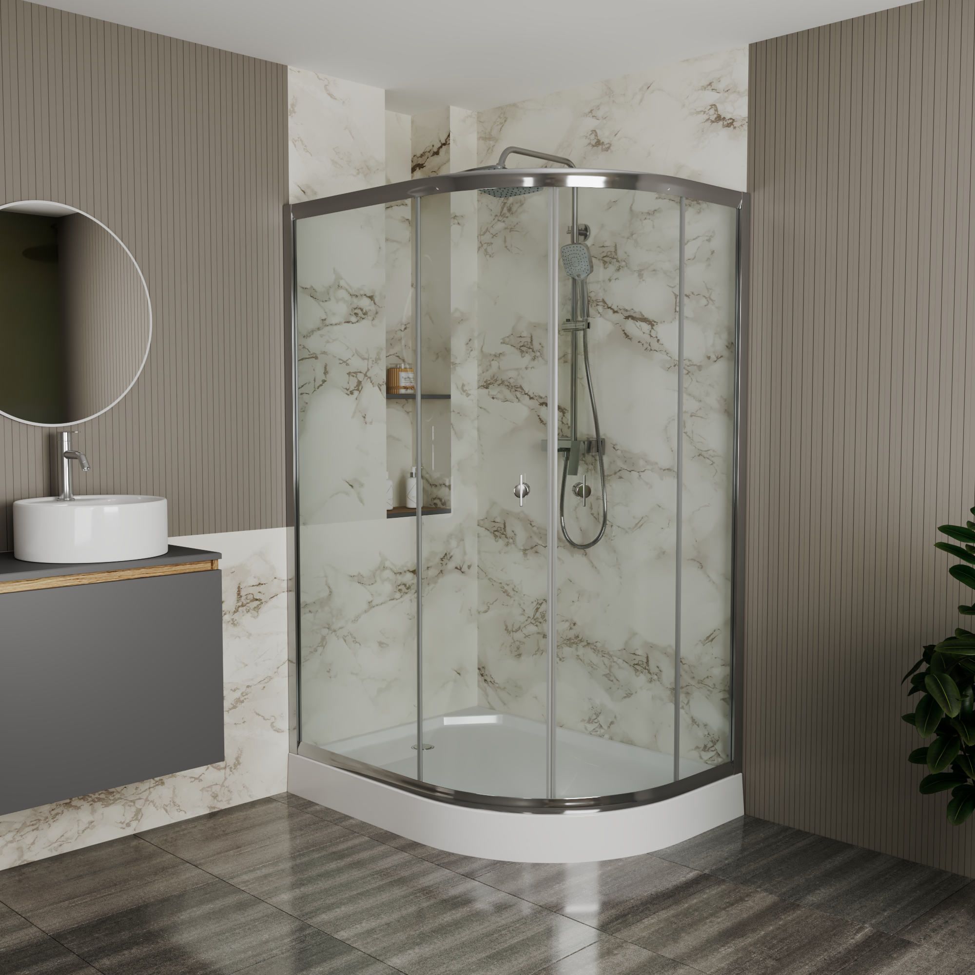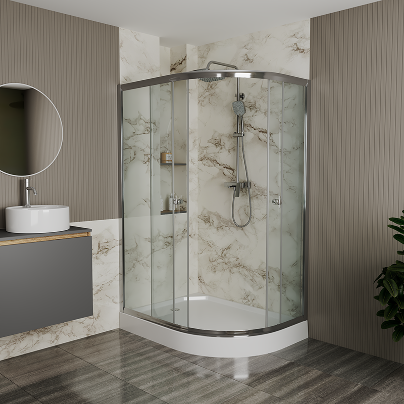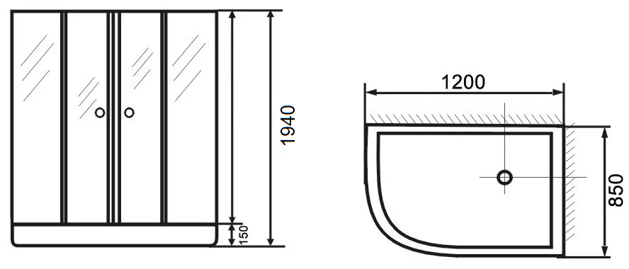 Душевой уголок BAU Dream Hit с поддоном 120x85х195, прозрачное закаленное стекло, хромированный профиль, левая имеет нестандартную форму, использовано прозрачное закаленное стеклянное полотно. Профиль выполнен из алюминия. Этот лёгкий и прочный материал хорошо переносит повышенную влажность в ванной комнате.