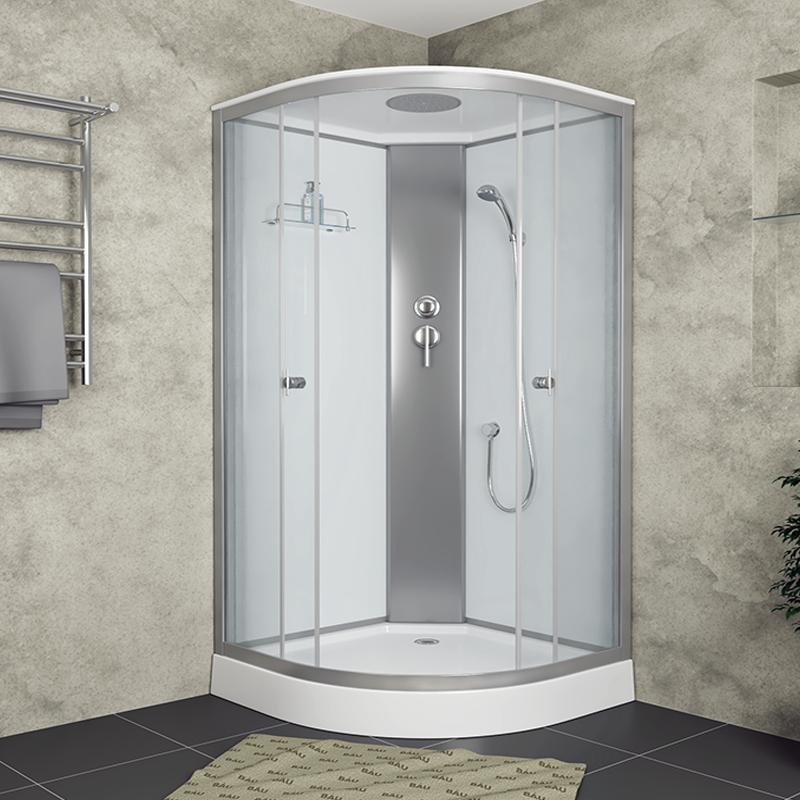 Душевая кабина BAU Dream Hit Black 100x100х215, прозрачное закаленное стекло, белая не будет загромождать пространство ванной комнаты благодаря своим небольшим габаритным размерам и дизайну. Кабина выполнена в форме четверти круга со стороной 100 см, использовано прозрачное закаленное стеклянное полотно. Профиль выполнен из алюминия. Этот лёгкий и прочный материал хорошо переносит повышенную влажность в ванной комнате.