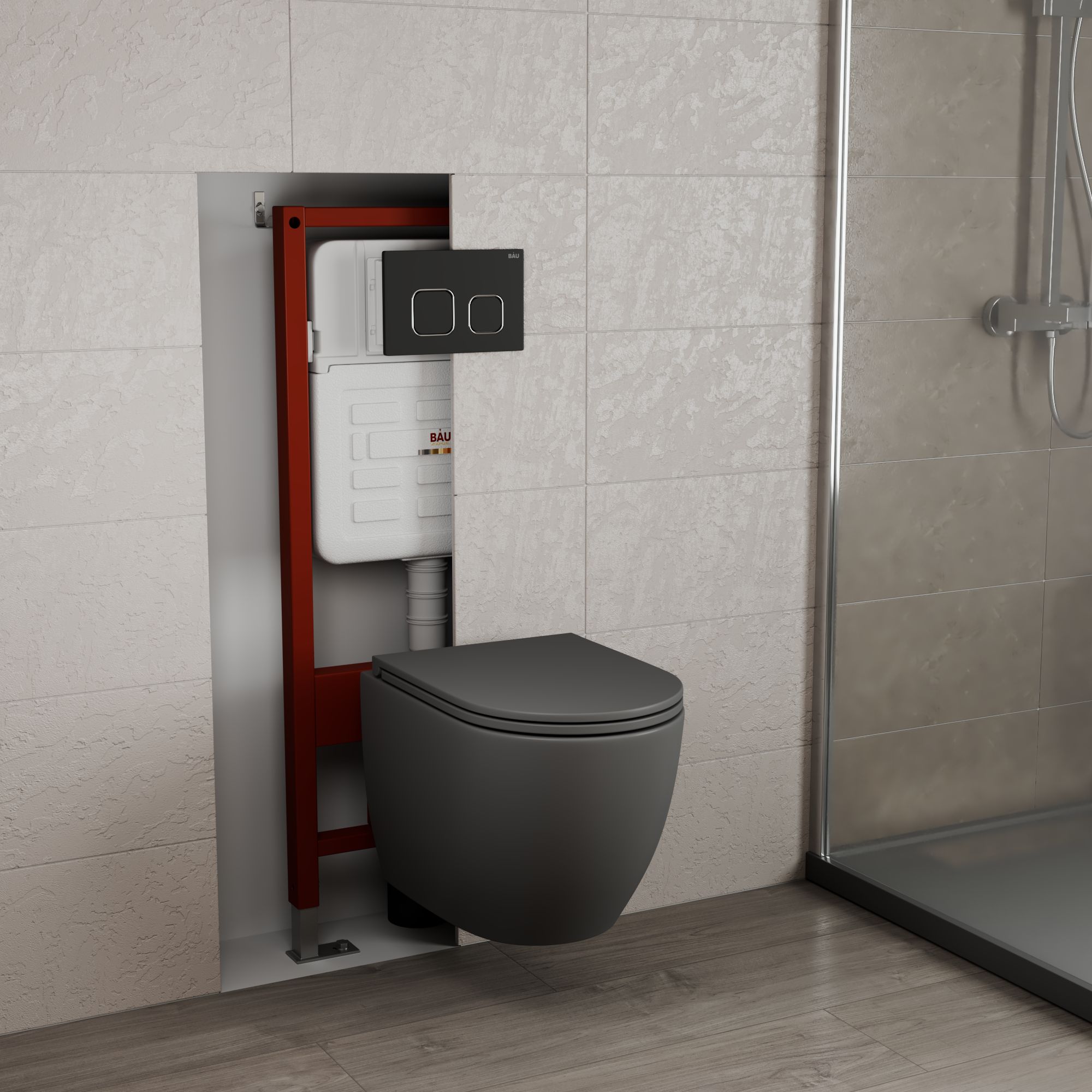 Комплект BAU 6 в 1: усиленная инсталляция BAU IDEAL, унитаз подвесной безободковый торнадо обратного потока Bau Dream 52х36 Hurricane-2 темно-серый матовый, сиденье дюропласт микролифт, клавиша BAU Strike, черная матовая.
