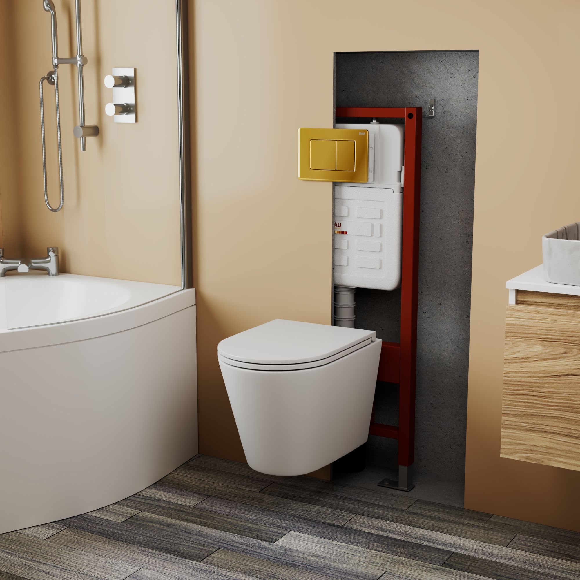 Комплект BAU 6 в 1: усиленная инсталляция BAU IDEAL, унитаз подвесной безободковый вихревой Bau Nimb Hurricane3, сиденье дюропласт микролифт, клавиша BAU Light антивандальная, нерж. сталь золото.