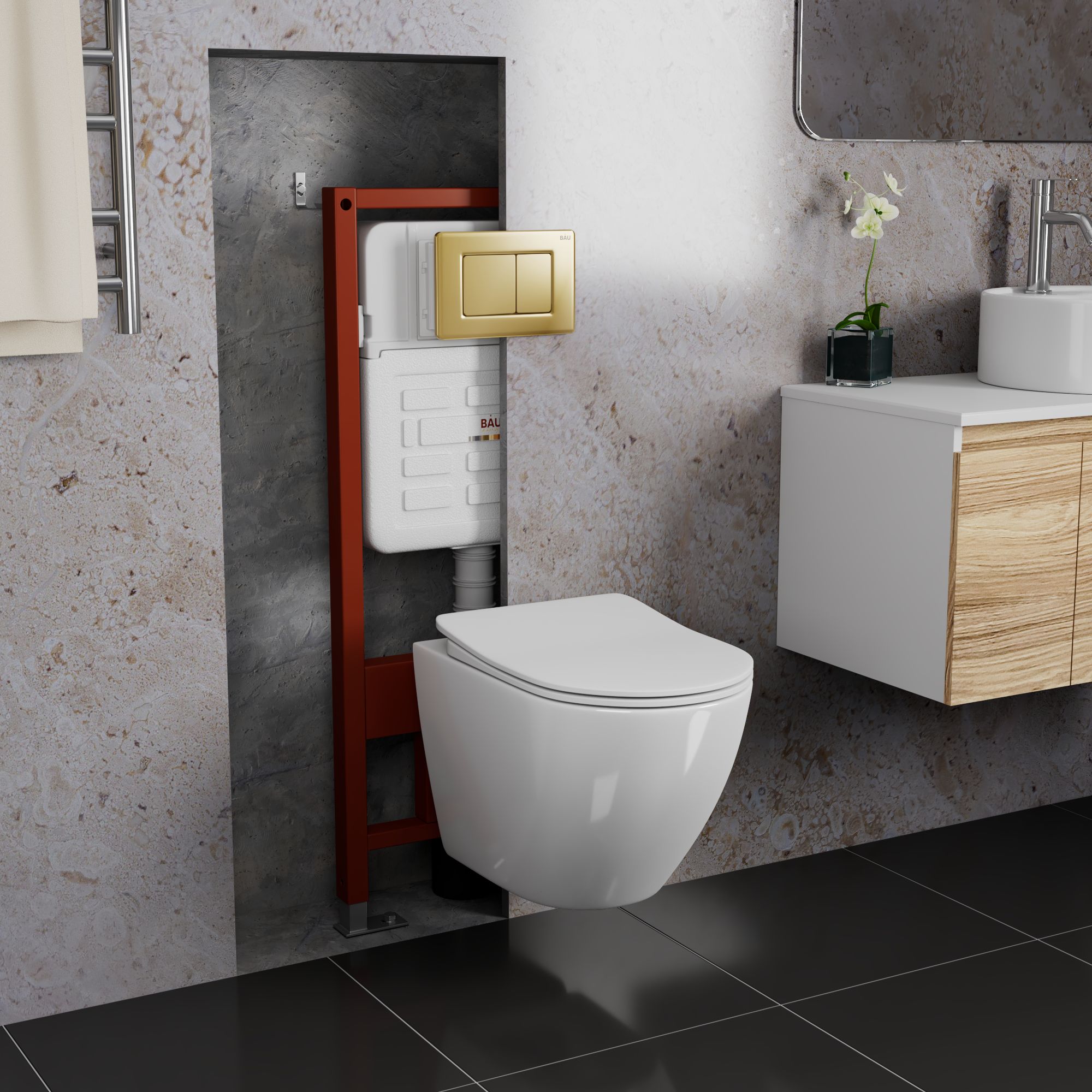 Комплект BAU 6 в 1: усиленная инсталляция BAU IDEAL, унитаз подвесной безободковый Bau Dream PRO-2, сиденье микролифт, клавиша BAU Light антивандальная, нерж. сталь золото.