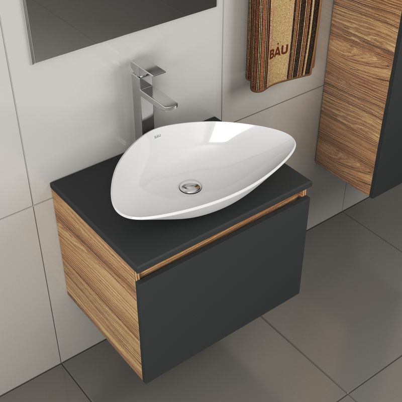 Тумба подвесная под раковину Bau Dream Blackwood 60, 1 ящик графит;Раковина накладная треугольная BAU Triangle 59х39, белая;Смеситель для умывальника высокий Hotel Still, нержавеющая сталь;Выпуск для раковины BAU клик-клак, слив click clack, донный клапан |