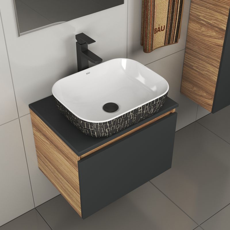 Тумба подвесная под раковину Bau Dream Blackwood 60, 1 ящик графит;Раковина накладная прямоугольная BAU Stil 50х40, белая/черная с орнаментом;Смеситель для умывальника высокий Hotel Black, черный;Выпуск для раковины BAU клик-клак, слив click clack, донный |