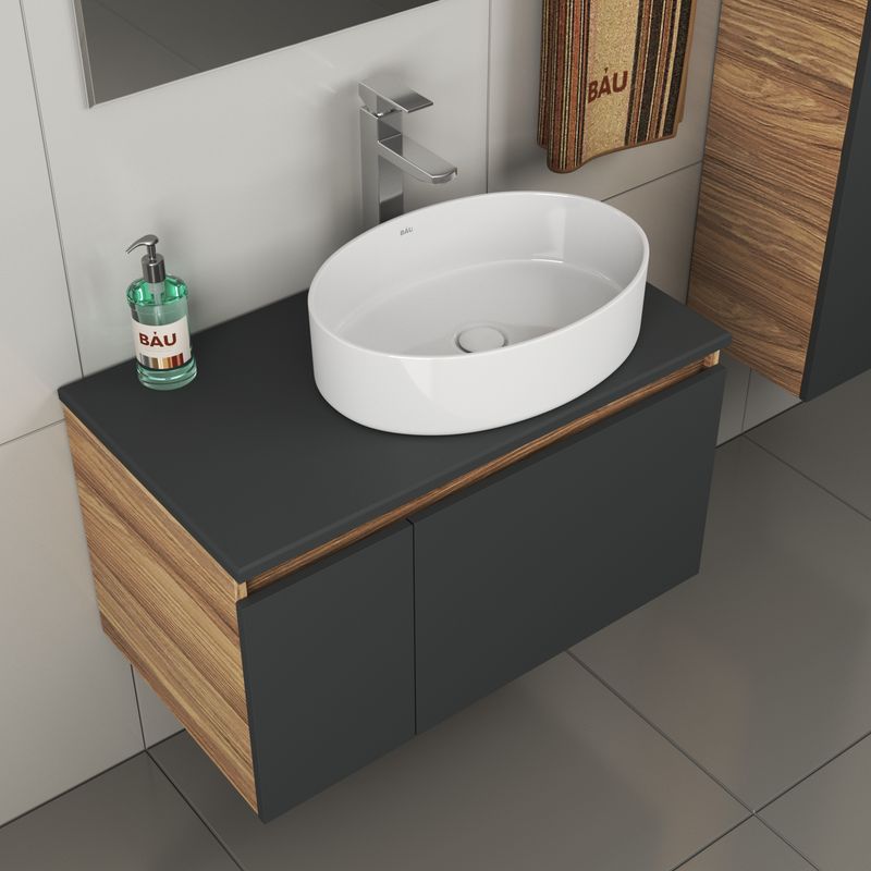 Тумба подвесная под раковину Bau Dream Blackwood 80, 1 ящик, дверца слева графит;Раковина накладная овальная BAU Nimb 50х36, белая;Смеситель для умывальника высокий Hotel Still, нержавеющая сталь;Выпуск стальной для раковины BAU клик-клак, белый |