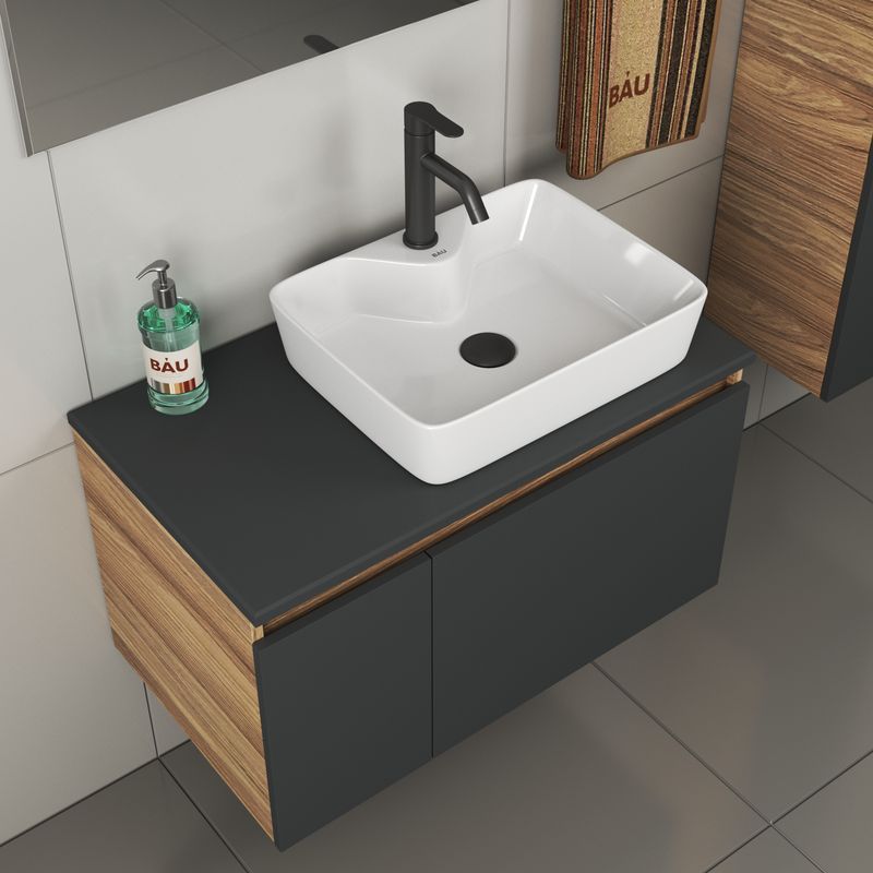 Тумба подвесная под раковину Bau Dream Blackwood 80, 1 ящик, дверца слева графит;Раковина прямоугольная накладная BAU Cerama 48х37, с отверстием под смеситель, белая;Смеситель для умывальника Dream Black, черный;Выпуск для раковины BAU клик-клак, слив cli |