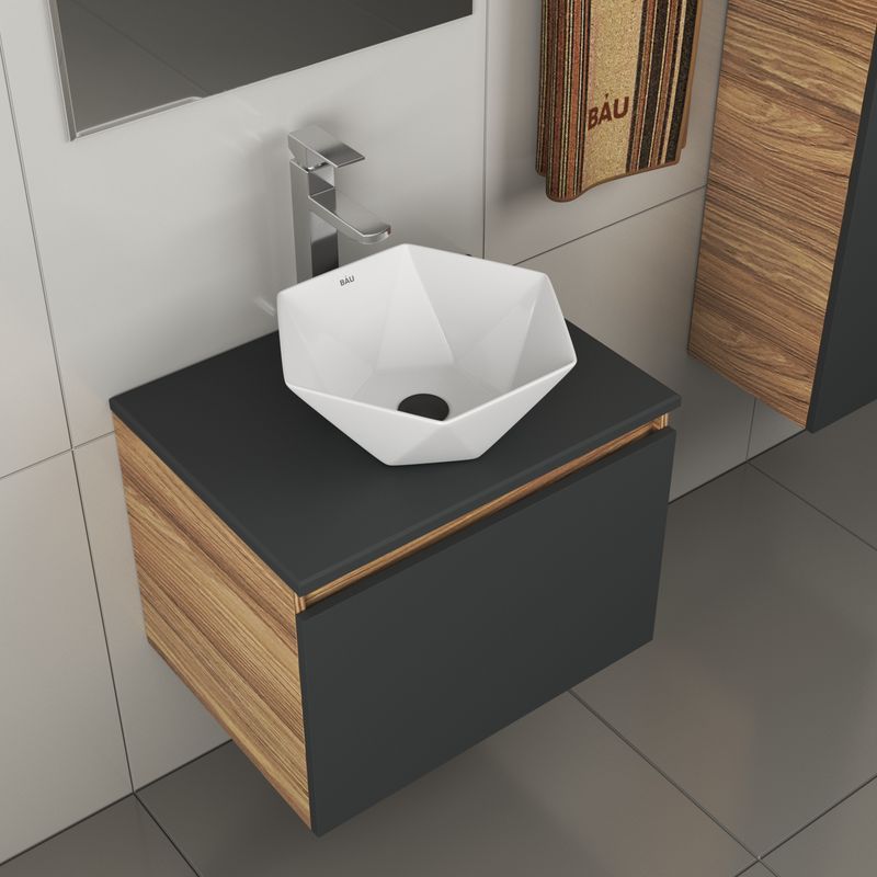 Тумба подвесная под раковину Bau Dream Blackwood 60, 1 ящик графит;Раковина накладная на столешницу BAU Crystal 40х40, белая;Смеситель для умывальника высокий Hotel Still, нержавеющая сталь;Выпуск для раковины BAU клик-клак, слив click clack, донный клапа |