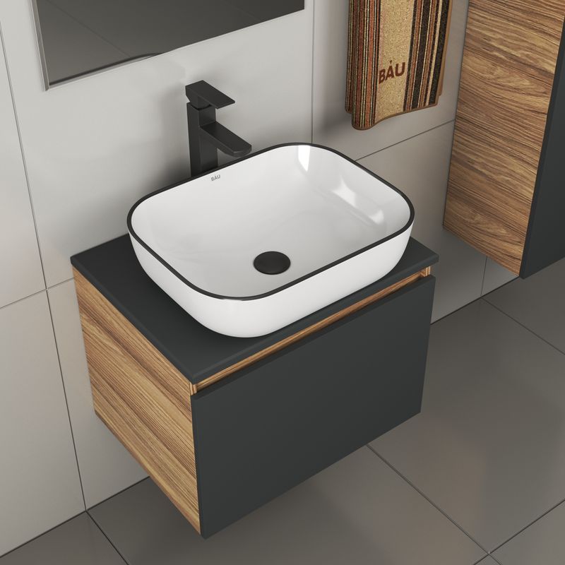 Тумба подвесная под раковину Bau Dream Blackwood 60, 1 ящик графит;Раковина накладная прямоугольная BAU Stil 50х40, белая, черный кант;Смеситель для умывальника высокий Hotel Black, черный;Выпуск для раковины BAU клик-клак, слив click clack, донный клапан |