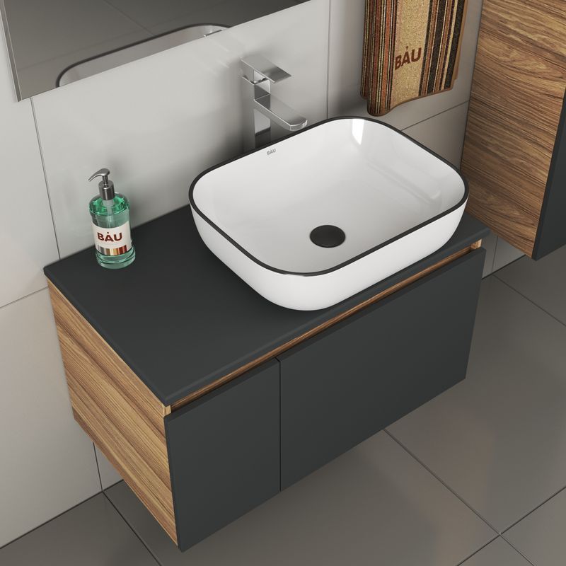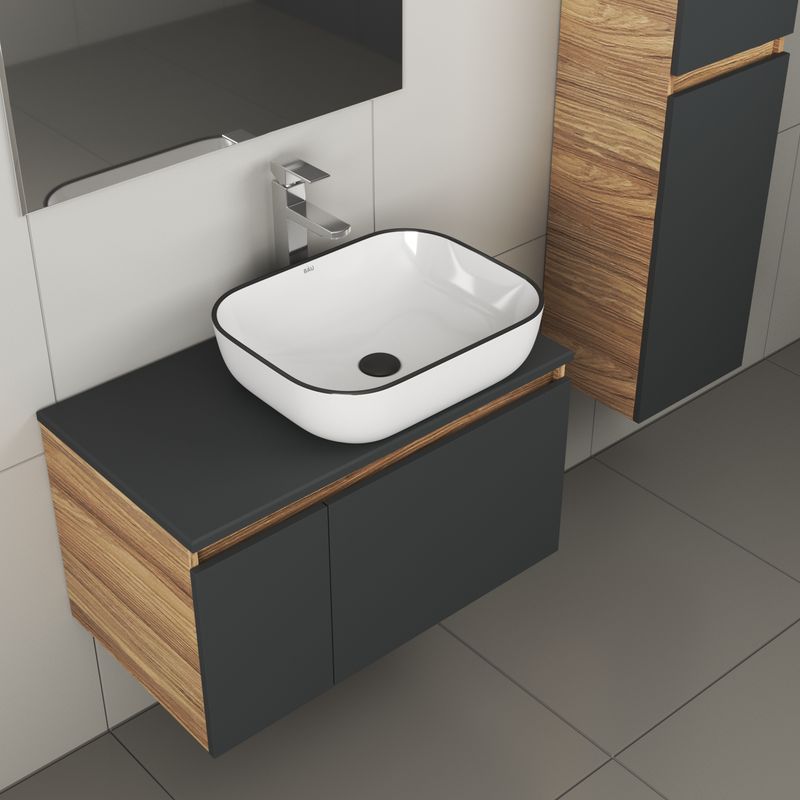 Тумба подвесная под раковину Bau Dream Blackwood 80, 1 ящик, дверца слева графит;Раковина накладная прямоугольная BAU Stil 50х40, белая, черный кант;Смеситель для умывальника высокий Hotel Still, нержавеющая сталь;Выпуск для раковины BAU клик-клак, слив c |