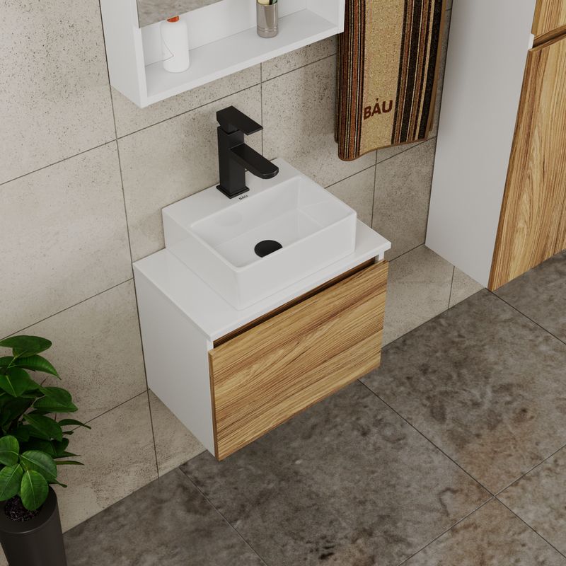 Тумба подвесная под раковину Bau Dream Blackwood 50, 1 ящик,Раковина накладная прямоугольная BAU Stil Pro 50х40, белая,Смеситель для умывальника Hotel Black, черный,Выпуск для раковины BAU клик-клак, черный |