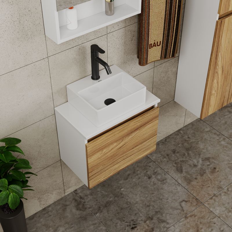 Тумба подвесная под раковину Bau Dream Blackwood 50, 1 ящик,Раковина накладная прямоугольная BAU Stil Pro 50х40, белая,Смеситель для умывальника Dream Black, черный,Выпуск для раковины BAU клик-клак, черный |