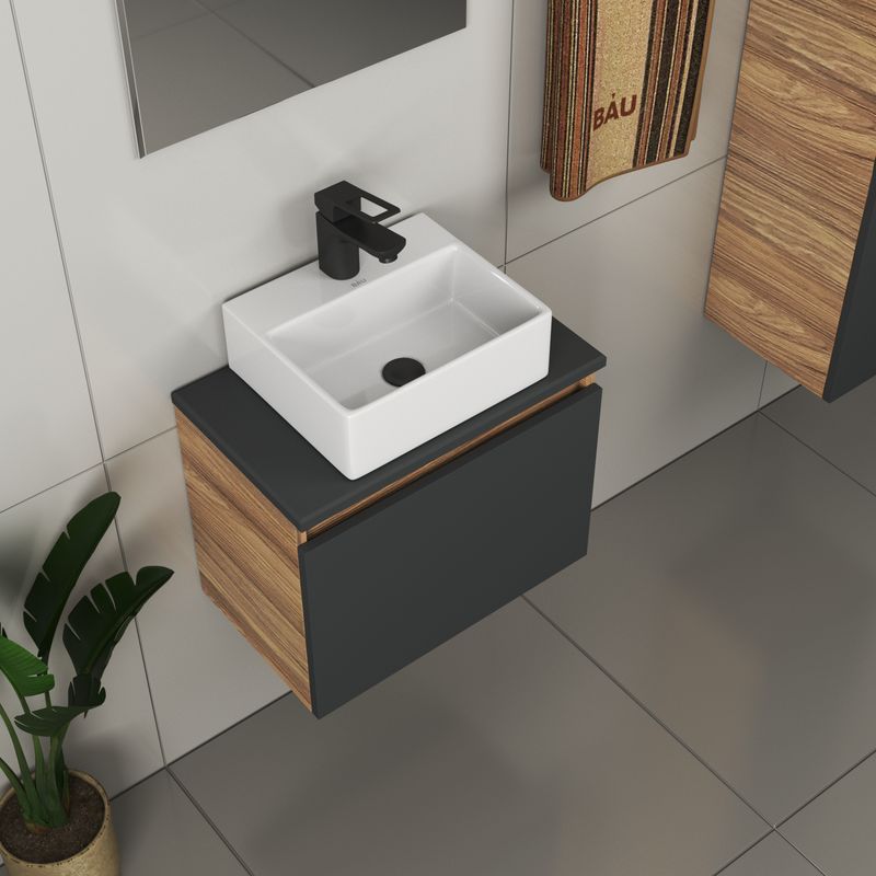 Тумба подвесная под раковину Bau Dream Blackwood 50, 1 ящик графит,Раковина накладная прямоугольная BAU Stil Pro 50х40, белая,Смеситель для умывальника Cerama Black, черный,Выпуск для раковины BAU клик-клак, черный |