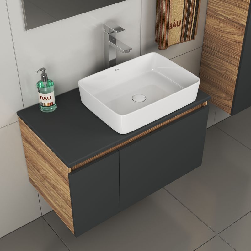 Тумба подвесная под раковину Bau Dream Blackwood 80, 1 ящик, дверца слева графит;Раковина накладная прямоугольная BAU Hotel 48х37, белая;Смеситель для умывальника высокий Hotel Still, нержавеющая сталь;Выпуск стальной для раковины BAU клик-клак, белый |