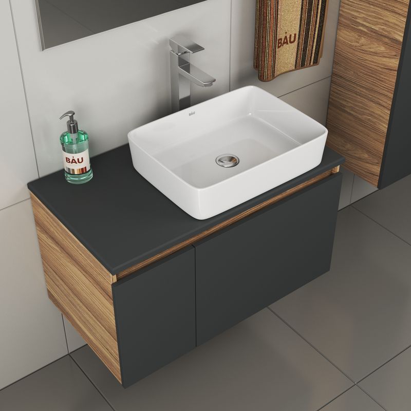 Тумба подвесная под раковину Bau Dream Blackwood 80, 1 ящик, дверца слева графит;Раковина накладная прямоугольная BAU Hotel 48х37, белая;Смеситель для умывальника высокий Hotel Still, нержавеющая сталь;Выпуск для раковины BAU клик-клак, слив click clack, |
