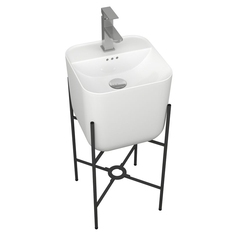 Раковина напольная с металлическими ножками BAU Soul белая имеет квадратную форму, и одно готовое отверстие для смесителя.