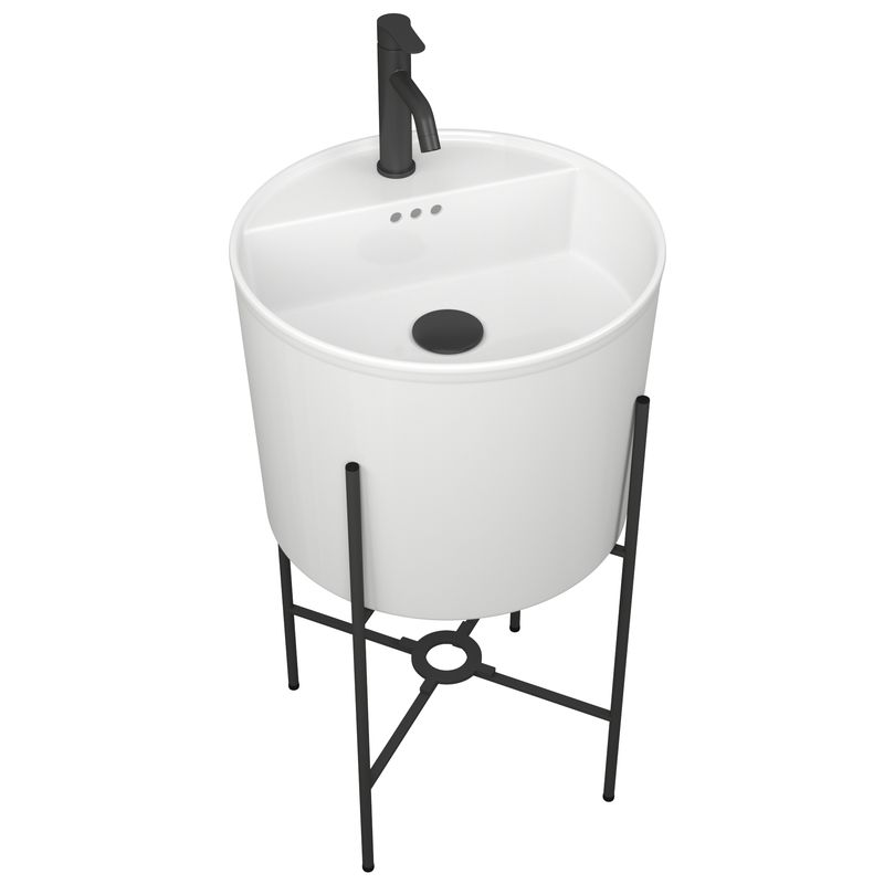Раковина напольная с металлическими ножками BAU Omega белая имеет круглую форму, и одно готовое отверстие для смесителя.