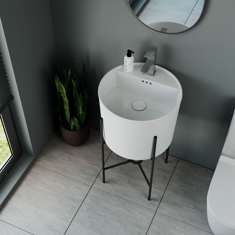 Раковина напольная с металлическими ножками BAU Omega белая имеет круглую форму, и одно готовое отверстие для смесителя.